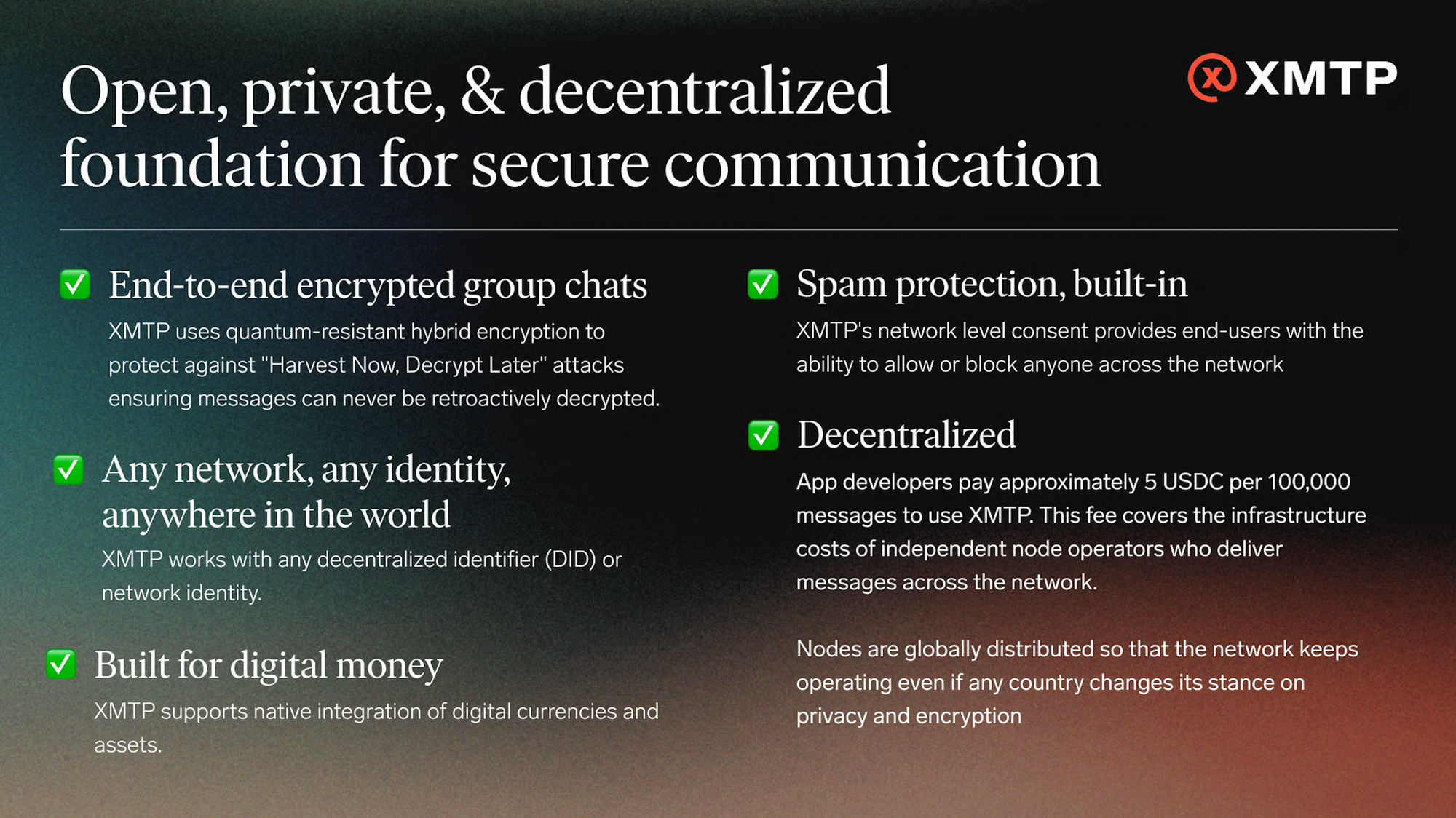 All of this is powered by XMTP, the decentralized messaging protocol securing the world's freedom to communicate.